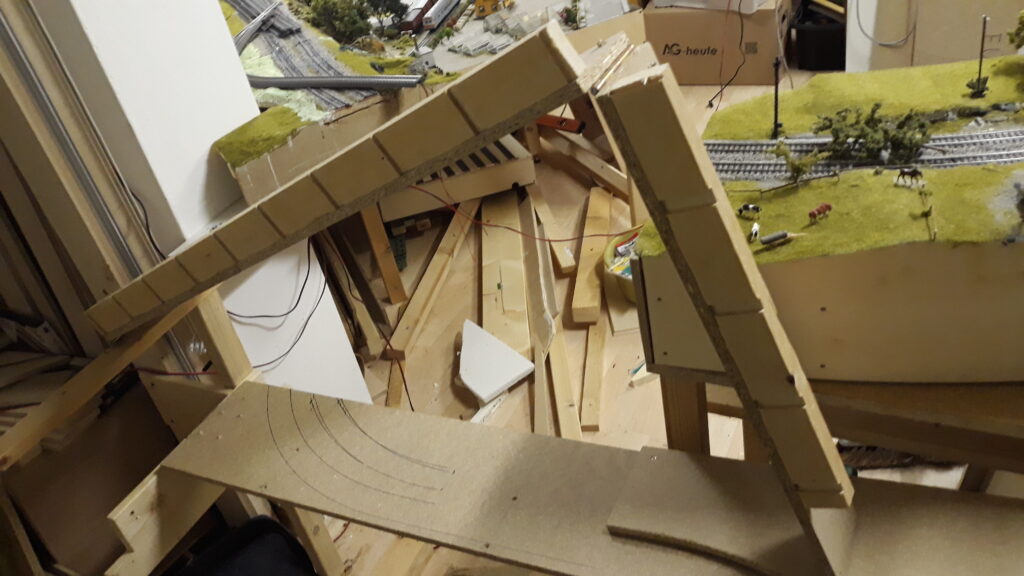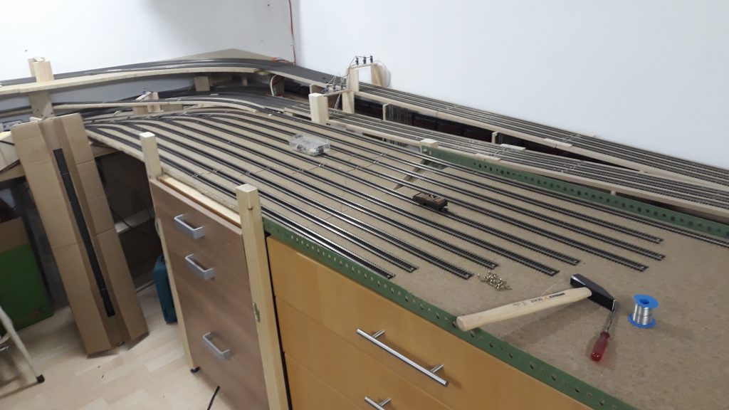 Der Gleiswendel-Schattenbahnhof ist mittlerweile an Ort und Stelle, aber nicht betriebsfähig, weil ich Prioritäten gesetzt habe, nämlich auf:
