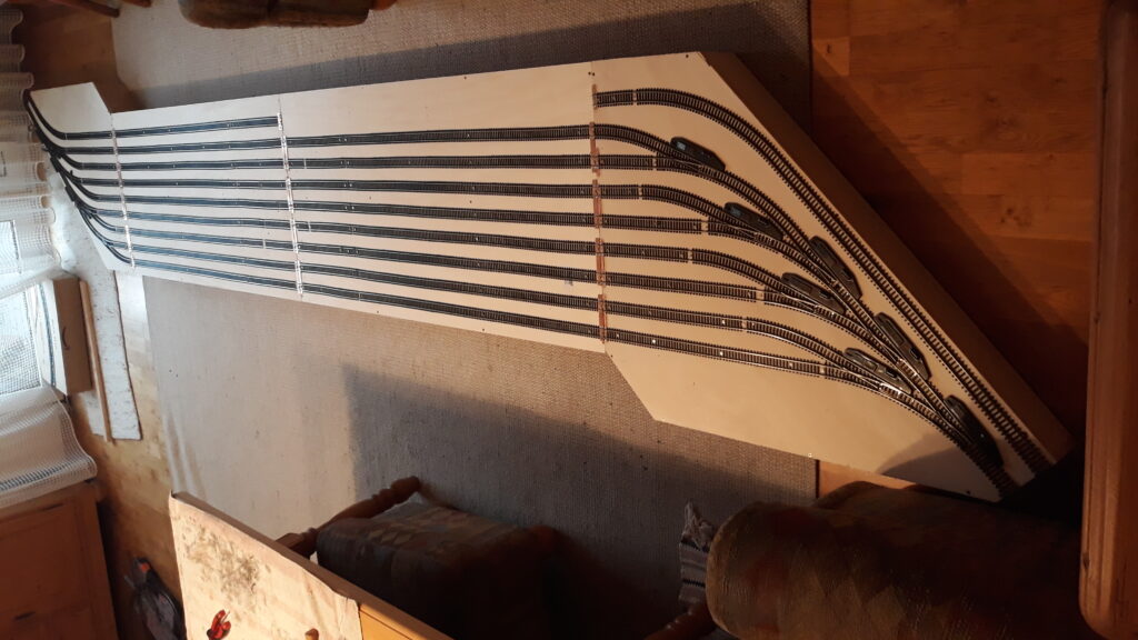 Der einzige sinnvolle Platz schien mir die Ebene unter den Bahnhofsmodulen zu sein. Bisher war da ja nur der Abstellbahnhof für die Nebenbahn mit seinen 3 Gleisen. Mittlerweile sind alle Bahnhofsmodule abgebaut und eine Sperrholzplatte eingezogen. Auf der linken Seite zweigt das Gleis vor der Auffahrt ab und fährt unter den Bahnhof. Auf der rechten Seite machen alle Gleise einen 90-Grad Bogen auf den rechten Tisch und reihen sich dort in die schon vorhandene Schleife ein.