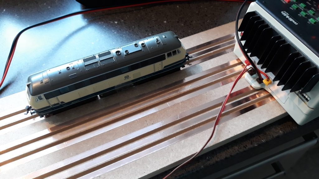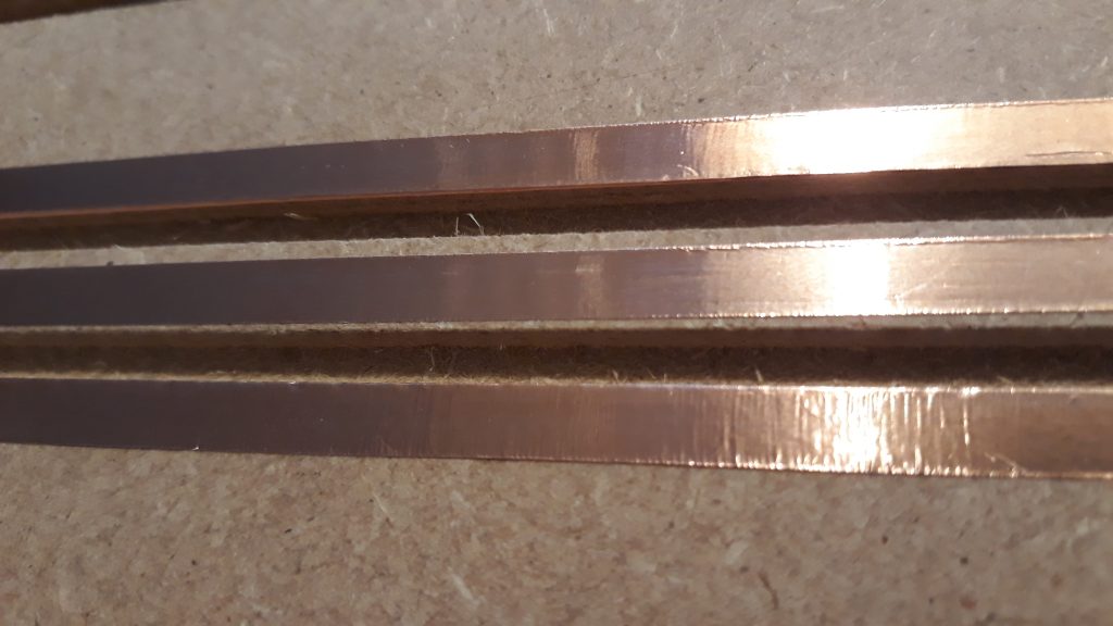 Das Abstellregal soll 10 Ebenen a 3 Gleise, also 30 Abstellgleise mit je 3,5 Meter zur Verfügung stellen. Also insgesamt 120 Meter Gleis. Ich hab zwar einiges an Gleisen, aber 120 Meter ???. Mir kam die Idee, die Gleise selbst zu bauen-aus Aluminiumprofilen. Immer noch zu teuer. Also noch minimalistischer: Nicht Gleise oder Profile auf die Regalbretter legen, sondern Nuten in die Bretter zu fräsen (juhu ich hab ja eine CNC-Fräse 🙂 ) und elektrisch leitfähiges Material aufzutragen. Zuerst versuchte ich es mit Alufolie aufkleben. Eine Wahnsinnsarbeit. Durch Zufall habe ich Klebeband gefunden, das einseitig mit Kupfer beschichtet ist. Mit dem habe ich es versucht und bin dabei geblieben. Ob es langfristig funktioniert, wird sich zeigen.