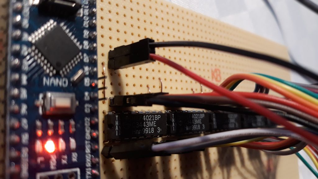 Darüber ist ein Spannungsregler, der mir aus der 12V-Leitung 5V macht, um den Arduino und die Servos zu versorgen.