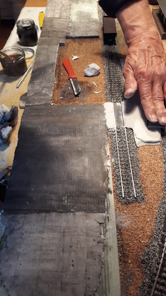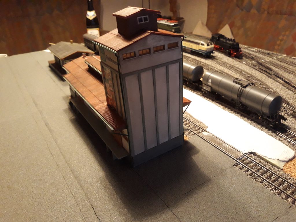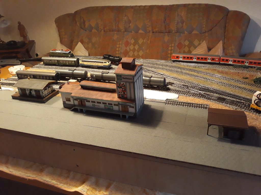 Die Hauptbahn ist ca 10 cm höher gelegen. Das gibt Raum für einen schönen Bahndamm mit Arkaden und viel Grün. Vielleicht auch noch weitere Schrebergärten.