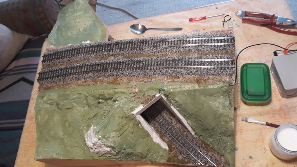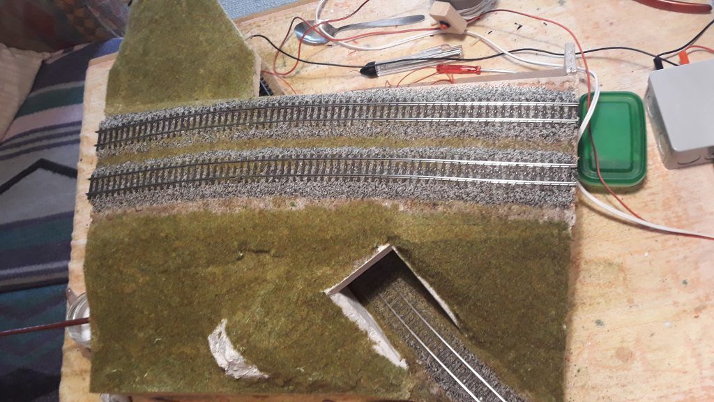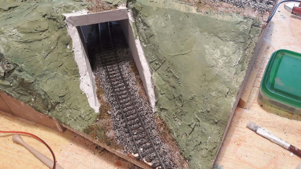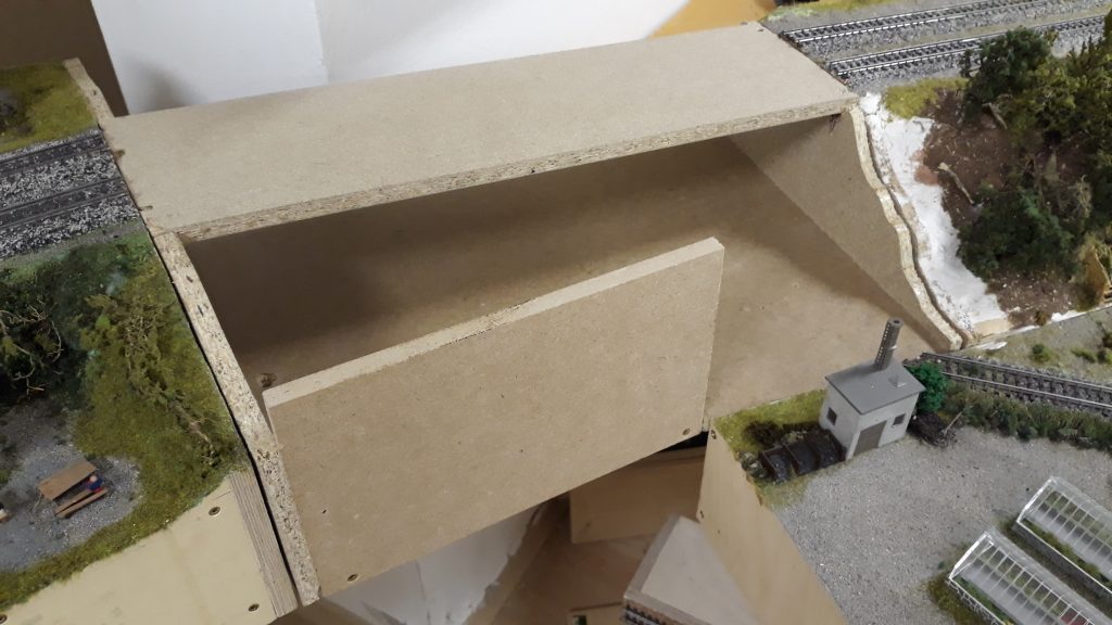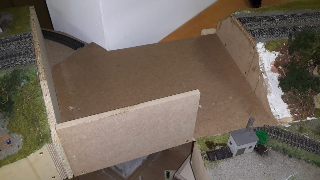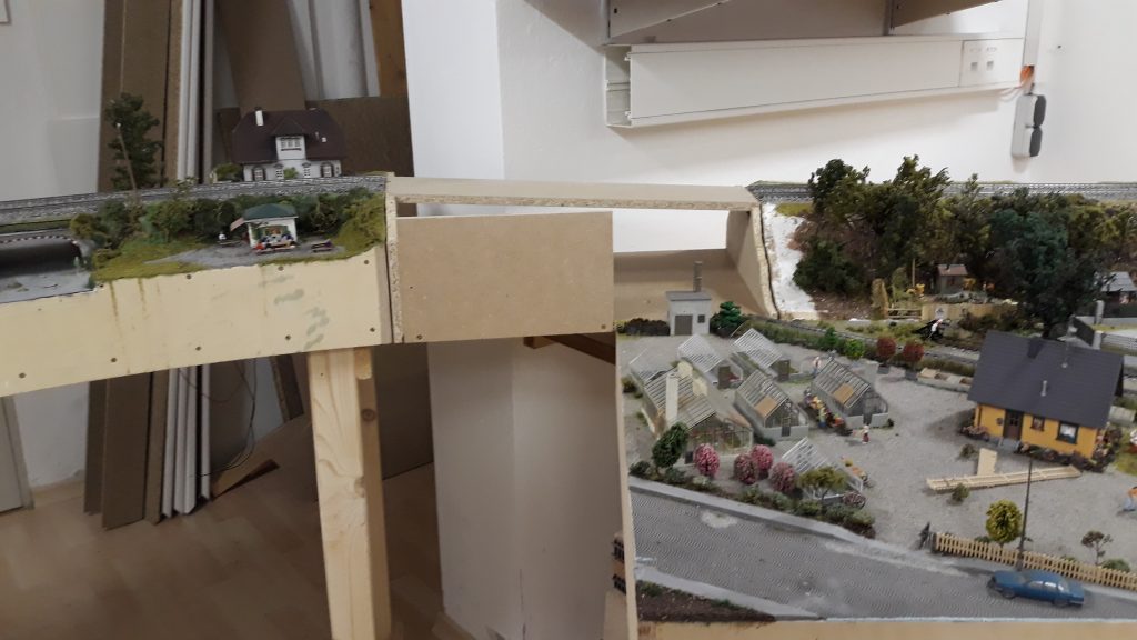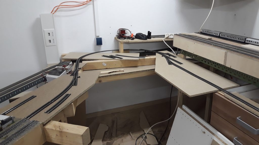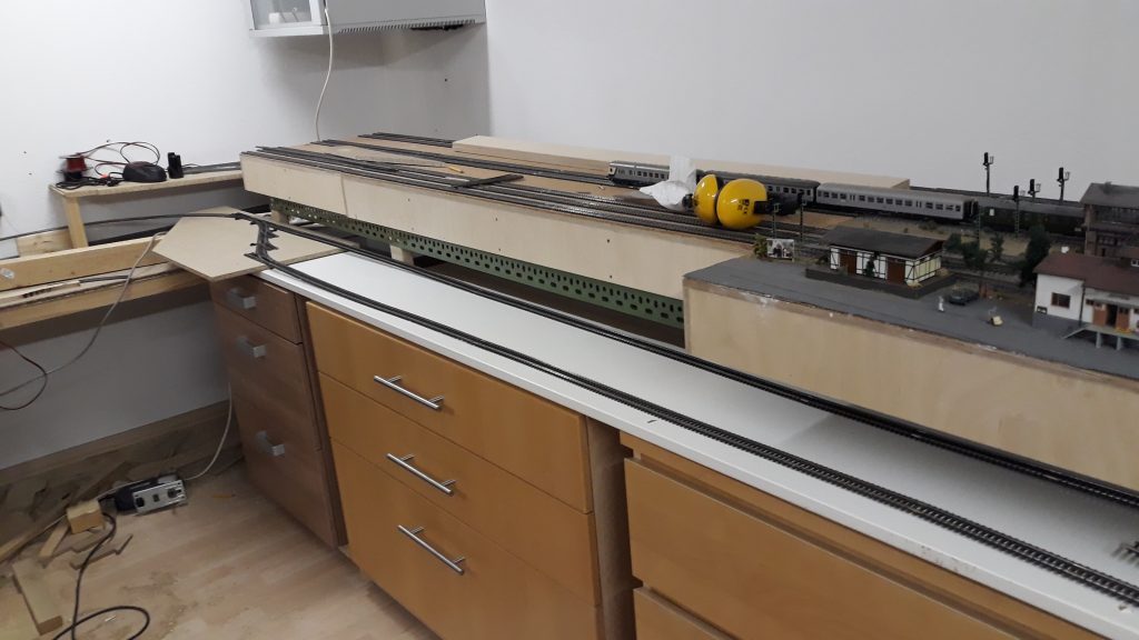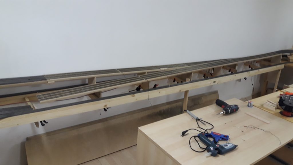 -Für 3 Module von der Bahnhofsausfahrt bis zu den Bogenmodulen hab ich den Rahmen gebaut, Verstrebungen, die Trassenbretter und den Kork. Das Schwierige daran: Es wird eine Gleiseinfädelung, die den Schattenbahnhof in die Hauptstrecke einfädelt. Das bedeutet, die Streck zum Bahnhof steigt an, die beiden abzweigenden Gleise führen nach unten.