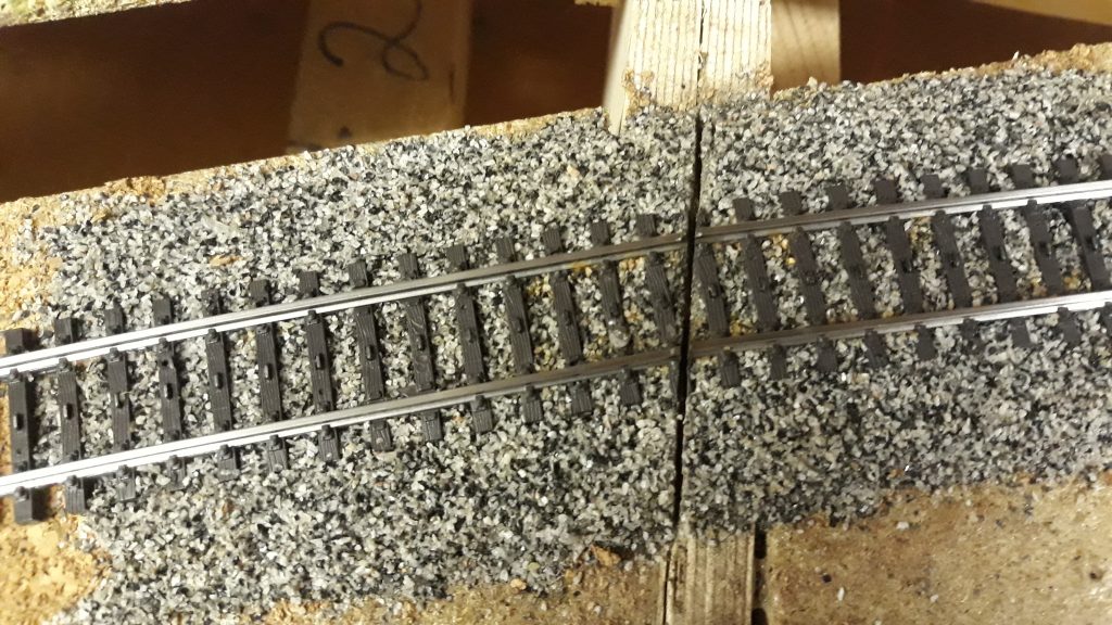 Die 3 Module der Einfädelung sind momentan durchgehend mit Gleis verbunden. Ich hab mir gedacht, ich probiers mal andersherum. Zuerst die Gleise durchgängig verlegen, dann an den Modulgrenzen schottern und wenn alles fest ist, mit dem Trennschleifer alles durchschneiden.