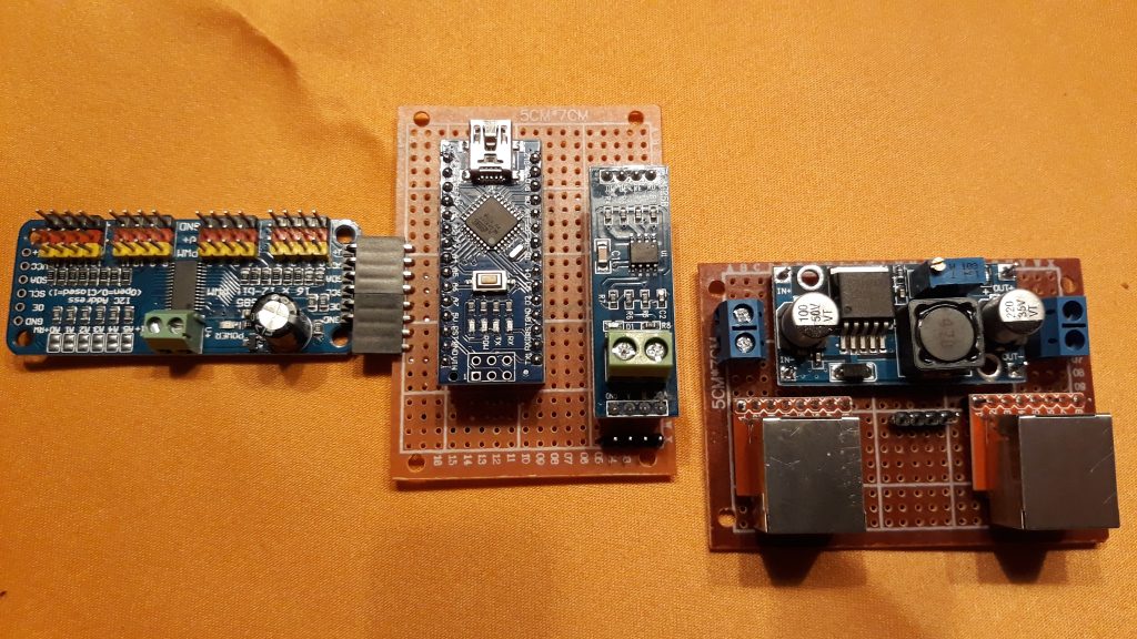 Für das Arduino-Modul habe ich mal ein Zusatzmodul gebaut, das an den I2C-Bus angesteckt werden kann. Damit ist es möglich, die Weichen im unsichtbaren Teil mit herkömmlichen Magnet-Weichenschaltern anzusteuern.