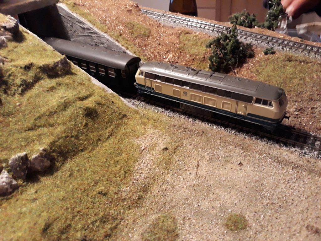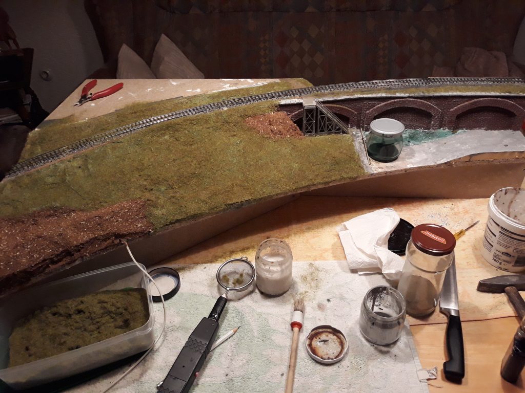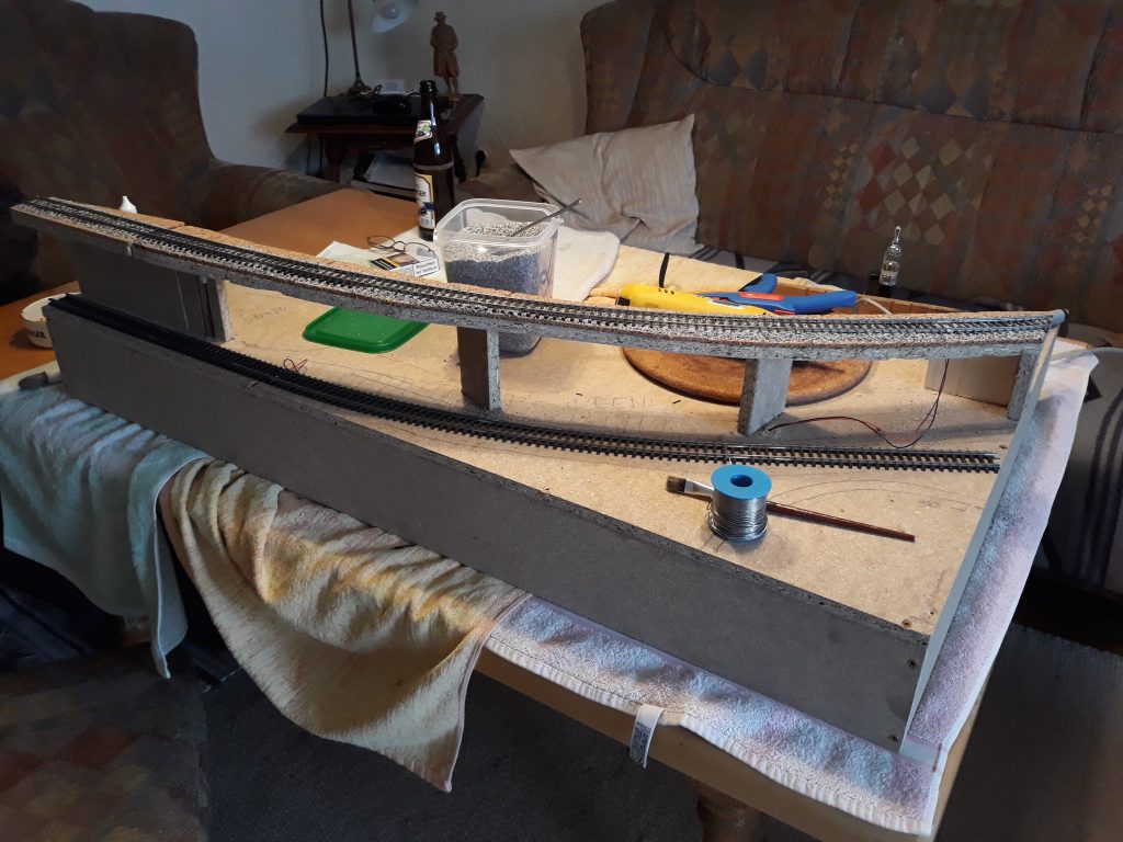 Dieses Modul beinhaltet die Auffahrt zum BW, den Tunneleingang der Nebenbahn und einen Teil der BW-Ebene. Es war etwas kompliziert, da es zwischen der Rückwand eines Bogenmoduls und dem geraden BW-Modul positioniert werden muss. Aber heute (27.4.19) wurde es fertig (die BW-Ebene folgt später)
